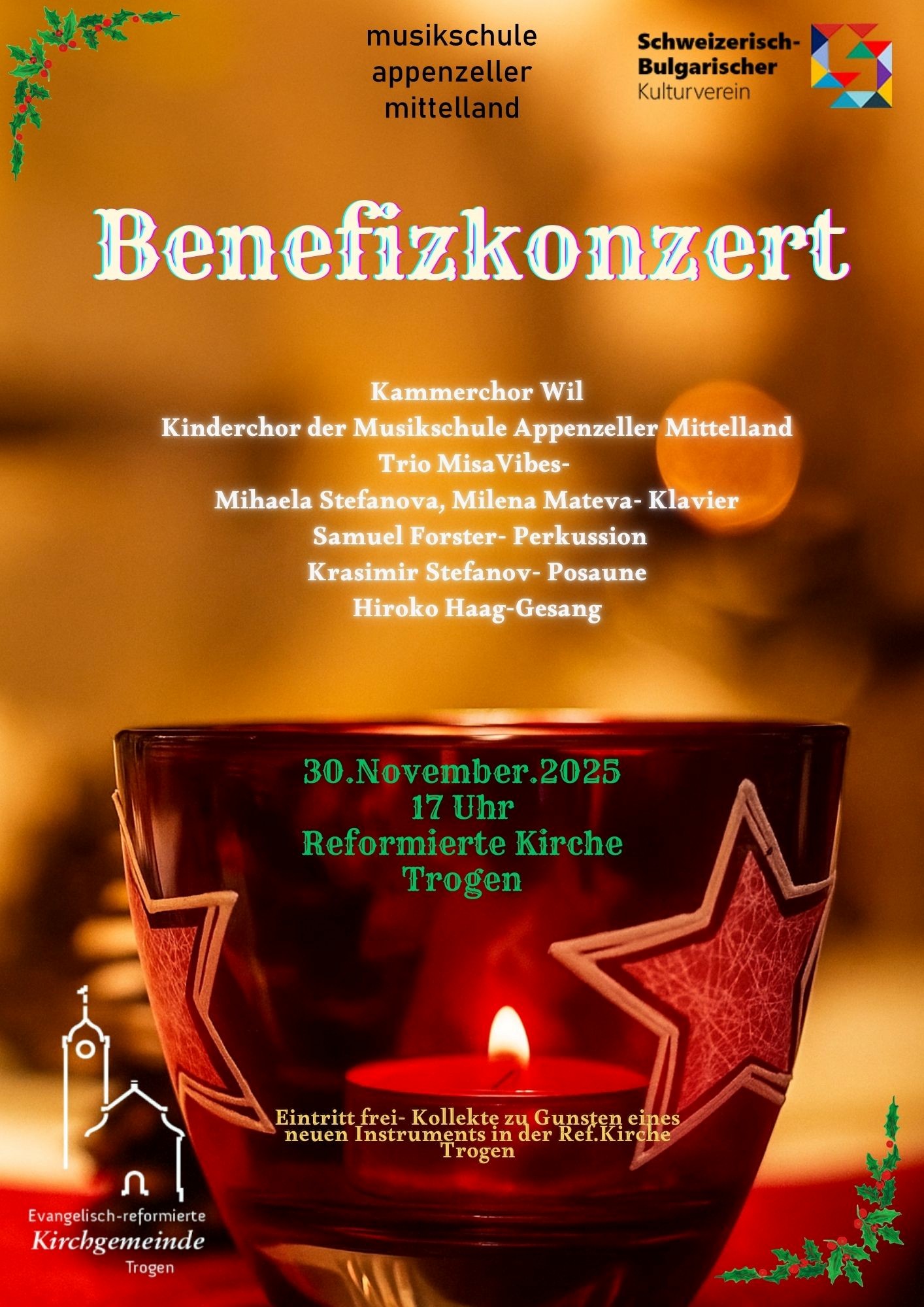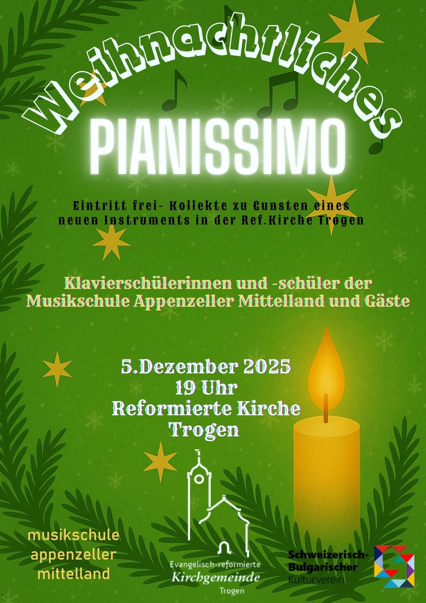 Am 05. Dezember 2025 um 19.00 Uhr laden die Musikschule Appenzeller Mittelland und die Kirchgemeinde Trogen Sie herzliche ein, zum Benefizkonzert zu Gunsten eines neuen Instruments in der Kirche Trogen.